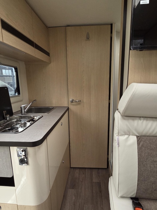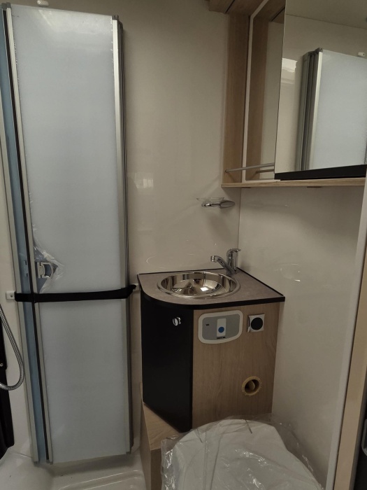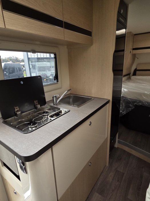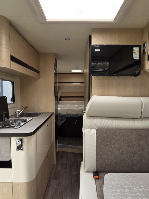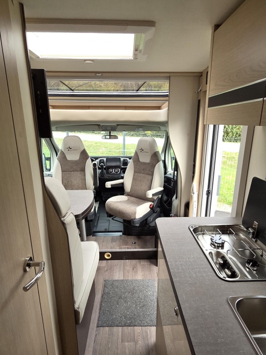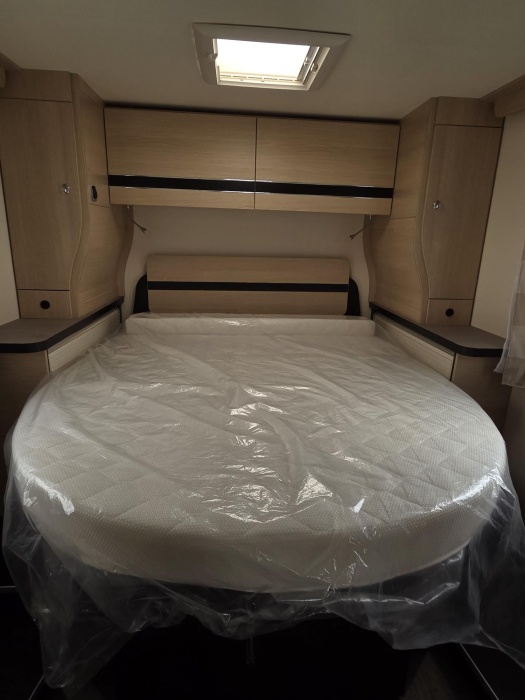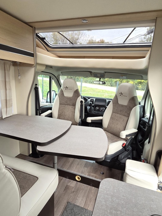 COMPACT LONGUEUR 699XLARGEUR 216 ET 279 HAUTEUR LIT CENTRAL BOITE AUTO JANTE ALU Caméra de recul avec lignes directionnelles Gas drive protection avec inverseur --(détendeur Panneau solaire 150W et régulateur haut rendement Rideau d'occultation cabine sur glissières Smart TV 22 pouces Station multimédia 9" Pionner Store extérieur